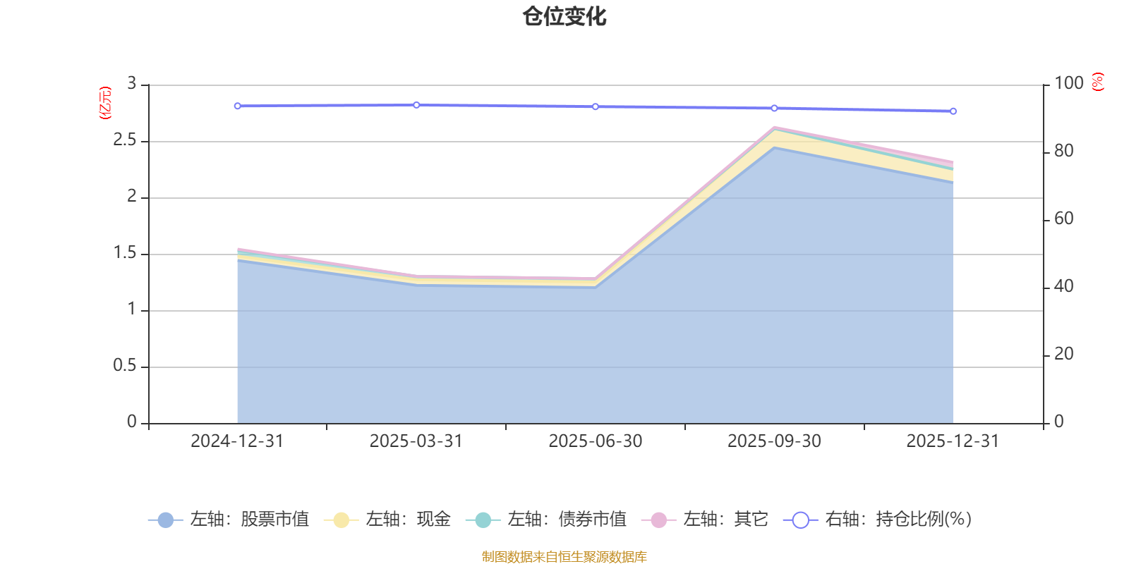 据定期报告数据统计,基金股票仓位长期保持较高水平,成立以来平均股票仓位为93.27%,同类平均为85.83%。2025年一季度末基金达到93.98%的最高仓位,2025年末最低,为92.14%。