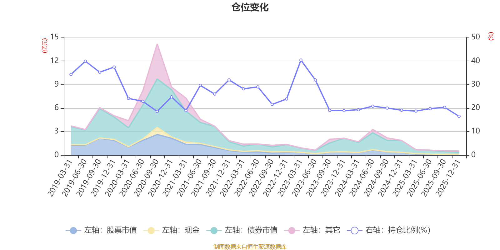 据定期报告数据统计,近三年平均股票仓位为22.08%,同类平均为19.2%。2023年一季度末基金达到40.4%的最高仓位,2025年末最低,为16.52%。