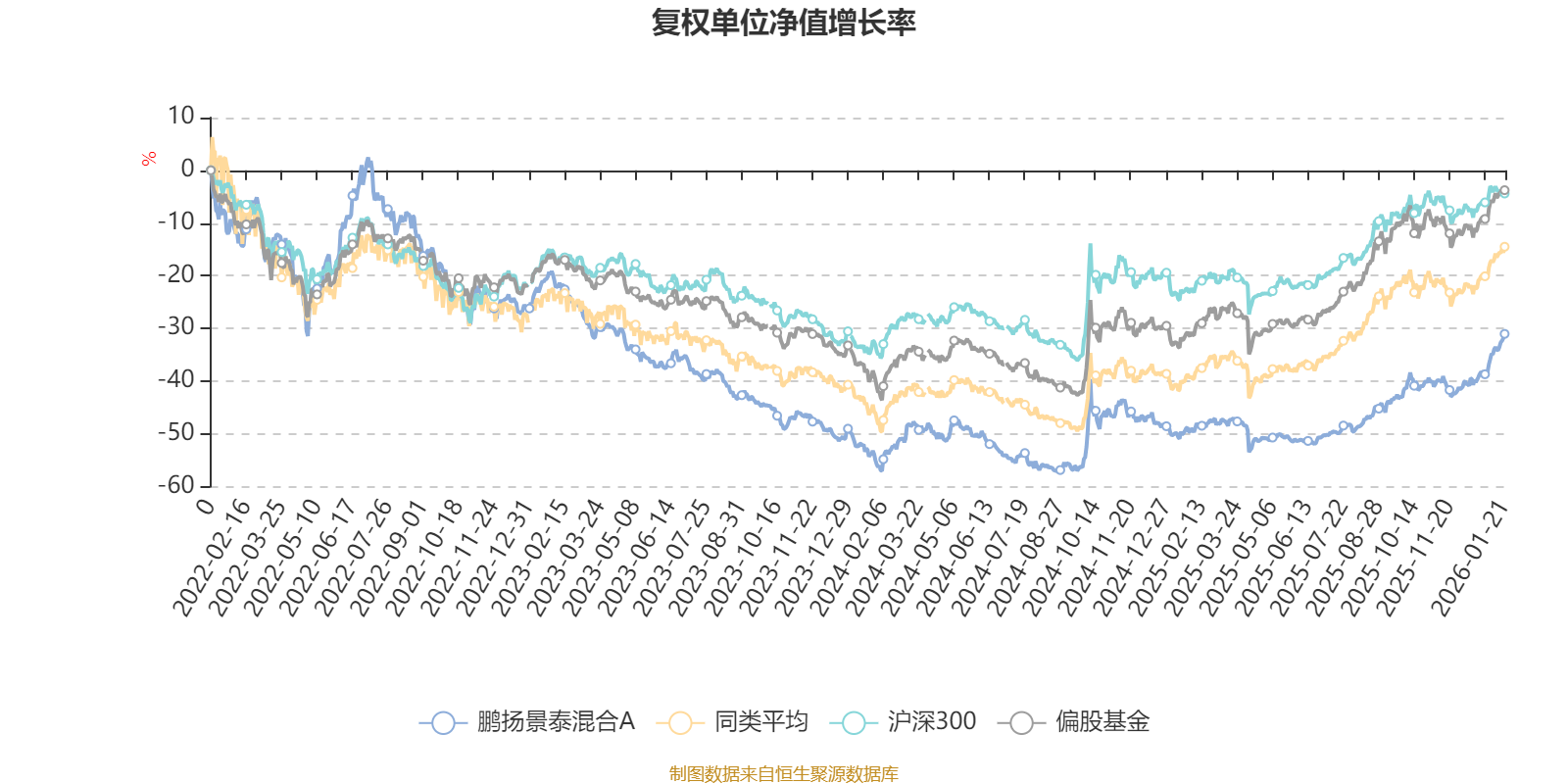 截至1月21日,鹏扬景泰混合A近三个月复权单位净值增长率为16.43%,位于同类可比基金72/621;近半年复权单位净值增长率为35.20%,位于同类可比基金169/621;近一年复权单位净值增长率为34.77%,位于同类可比基金362/613;近三年复权单位净值增长率为-13.58%,位于同类可比基金493/535。