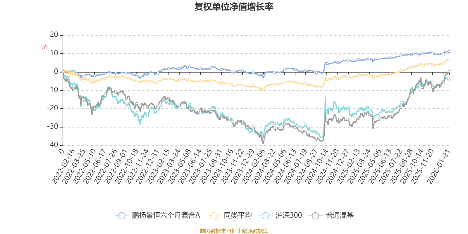 截至1月21日,鹏扬景恒六个月混合A近三个月复权单位净值增长率为1.00%,位于同类可比基金484/629;近半年复权单位净值增长率为1.99%,位于同类可比基金522/629;近一年复权单位净值增长率为4.84%,位于同类可比基金487/626;近三年复权单位净值增长率为9.51%,位于同类可比基金364/564。