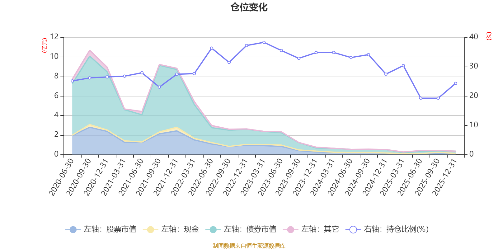 据定期报告数据统计,近三年平均股票仓位为30.34%,同类平均为19.2%。2023年一季度末基金达到38.3%的最高仓位,2025年上半年末最低,为19.24%。