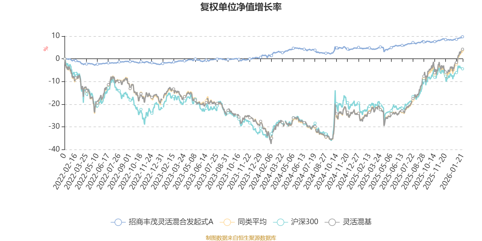 截至1月21日,招商丰茂灵活混合发起式A近三个月复权单位净值增长率为1.78%,位于同类可比基金1043/1286;近半年复权单位净值增长率为2.51%,位于同类可比基金1156/1286;近一年复权单位净值增长率为4.90%,位于同类可比基金1200/1286;近三年复权单位净值增长率为11.52%,位于同类可比基金748/1286。