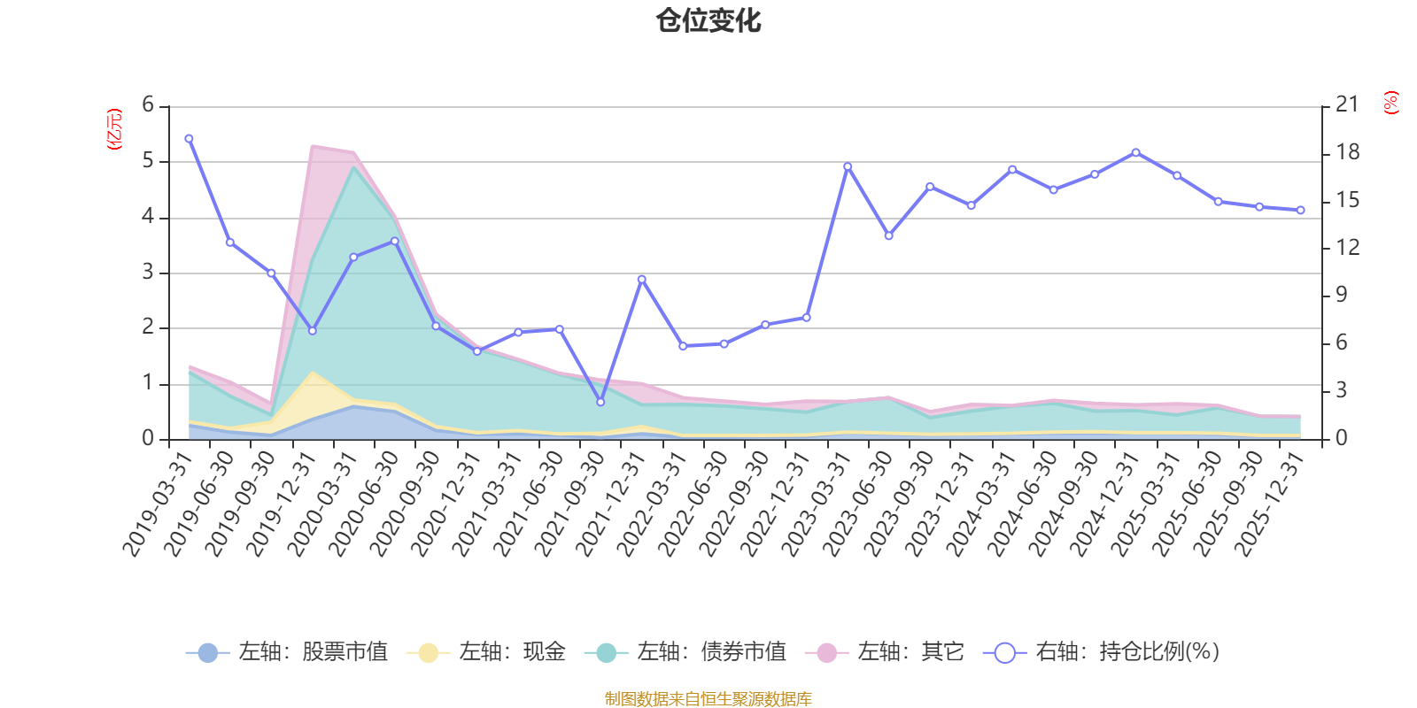 据定期报告数据统计,近三年平均股票仓位为15.75%,同类平均为72.57%。2019年一季度末基金达到18.96%的最高仓位,2021年三季度末最低,为2.35%。