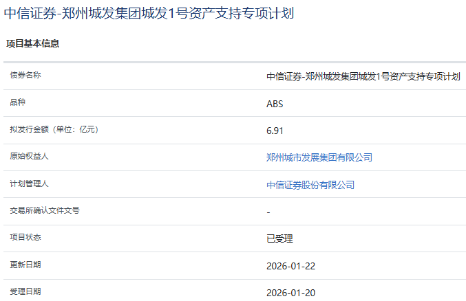 【大河财立方消息】1月22日,中信证券-郑州城发集团城发1号资产支持专项计划获上交所受理。项目拟发行金额6.91亿元,原始权益人为郑州城市发展集团有限公司,计划管理人为中信证券。2025年6月19日,经联合资信综合评定,郑州城市发展集团主体信用评级为AAA。