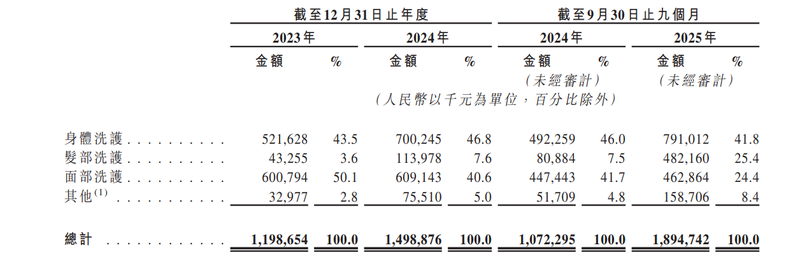 按产品划分,身体洗护是该公司的基石业务。2023年至2024年,该品类分别实现收入5.22亿元、7亿元,主要原因为销量增长以及美白身体乳、沐浴乳及身体磨砂膏等产品触达更多消费者。2025年前三季度,身体洗护产品收入约7.91亿元,收入占比达41.8%;同期,发部洗护和面部洗护产品的收入占比分别为25.4%、24.4%。
