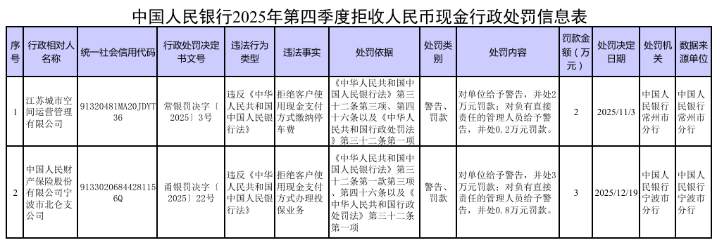 【大河财立方消息】1月22日,中国人民银行披露2025年第四季度拒收人民币现金行政处罚情况。2025年第四季度,中国人民银行对2家核实为拒收人民币现金的单位及相关责任人依法作出经济处罚。