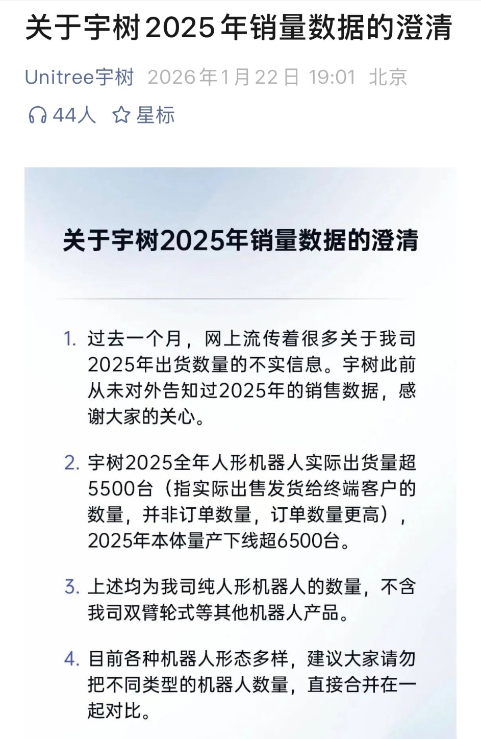 红星资本局1月22日消息,今日晚间,宇树科技官方微信公众号发布关于2025年销量数据的澄清称,过去一个月,网上流传着很多关于宇树科技2025年出货数量的不实信息。