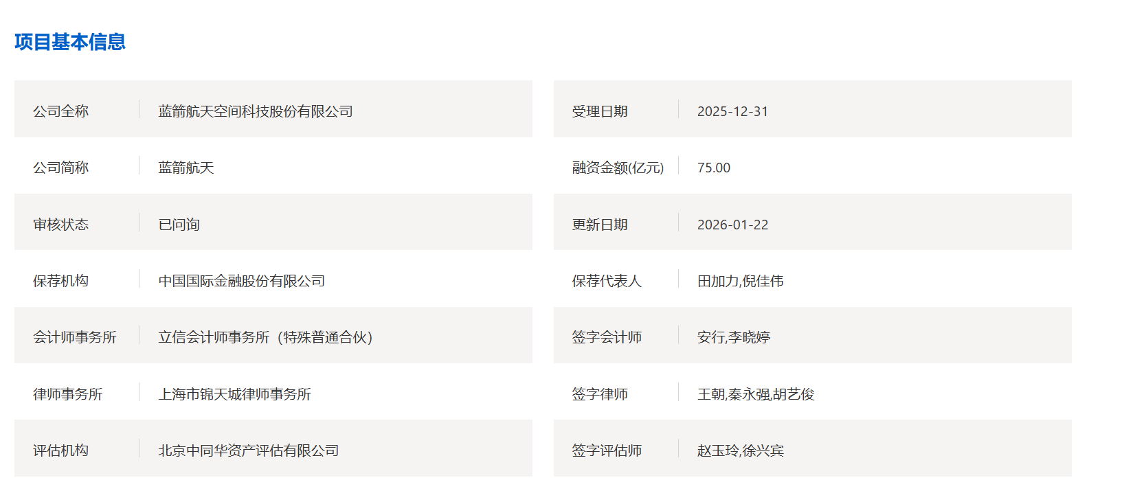 1月22日,上交所官网显示,蓝箭航天空间科技股份有限公司科创板IPO审核状态变更为“已问询”。