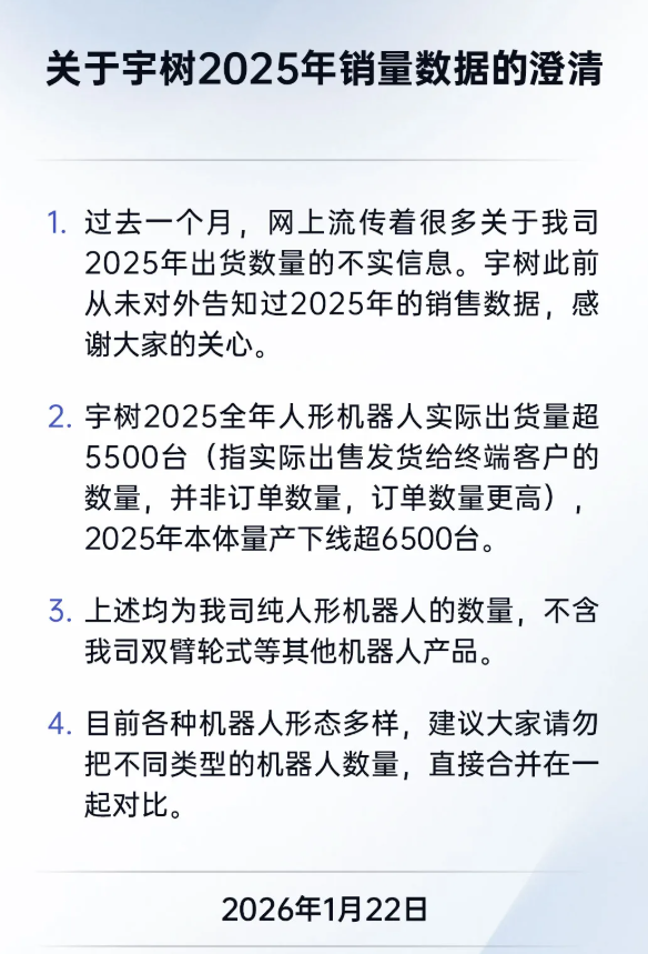 1月22日,宇树发文澄清2025年销量数据:过去一个月,网上流传着很多关于公司2025年出货数量的不实信息,宇树此前从未对外告知过2025年的销售数据。宇树2025全年人形机器人实际出货量超5500台(指实际出售发货给终端客户的数量,并非订单数量,订单数量更高),2025年本体量产下线超6500台。上述均为公司纯人形机器人的数量,不含公司双臂轮式等其他机器人产品。目前各种机器人形态多样,建议大家请勿把不同类型的机器人数量,直接合并在一起对比。