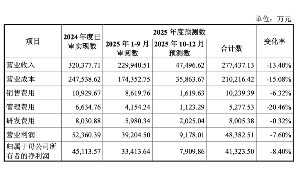 2025年度,公司预测实现营业收入27.74亿元,较2024年度下降13.4%,预计下降幅度较2025年1-9月进一步收窄2.49个百分点。