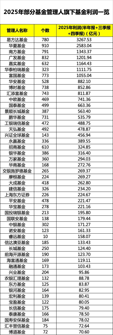 从2025年全年来看,公募基金依旧大丰收,合计盈利达到26041.07亿元,权益类基金仍是盈利的“大户”,易方达、华夏、南方、广发、嘉实、华泰柏瑞、富国基金利润超过1000亿元。