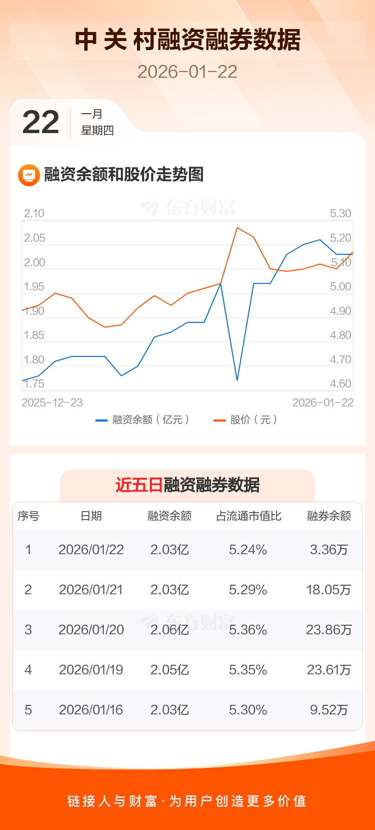 交易所最新数据显示,中 关 村于2026年1月22日获融资买入1000.11万元,融资偿还907.39万元,当日融资净买入92.72万元。目前,该股融资余额2.03亿,占流通市值比例为5.24%。
