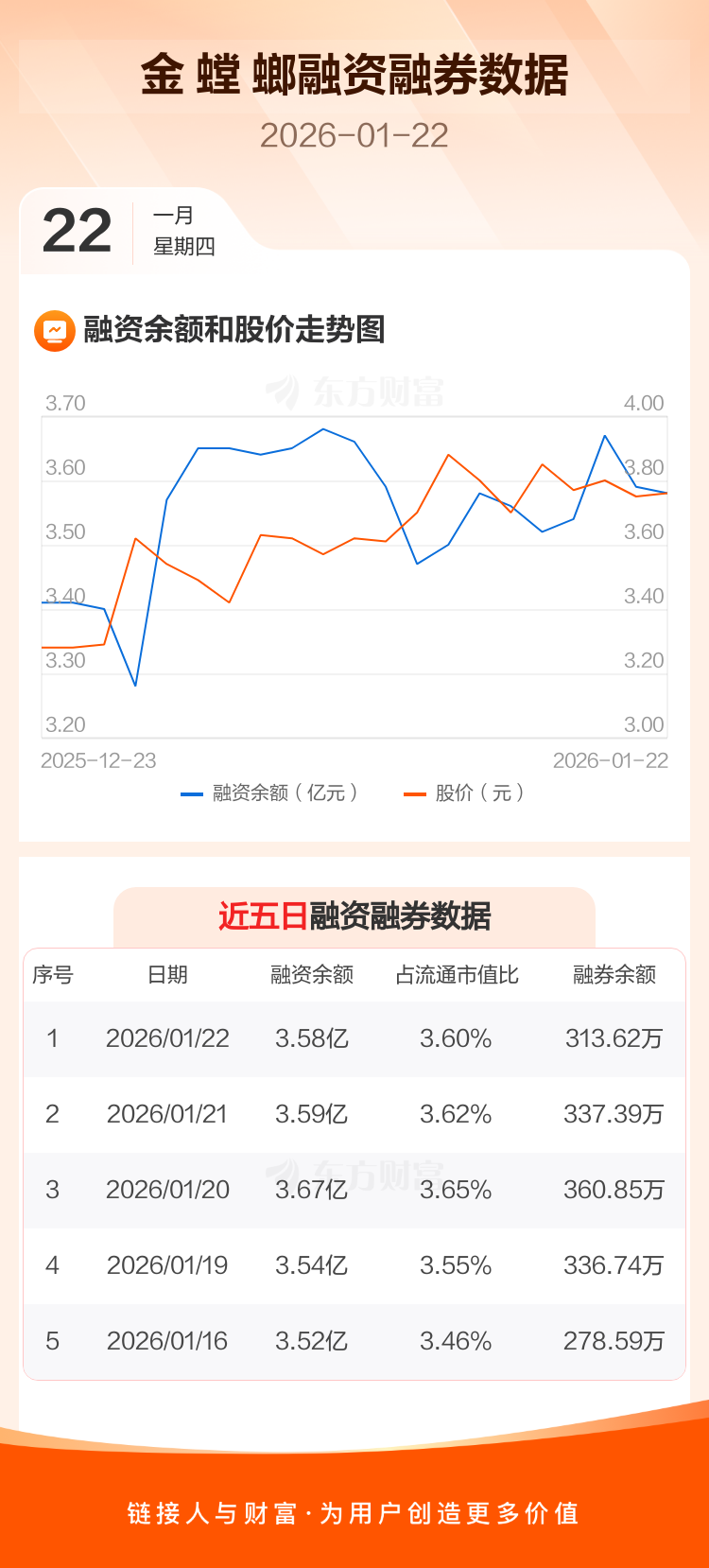 交易所最新数据显示,金 螳 螂于2026年1月22日获融资买入1645.39万元,融资偿还1721.06万元,当日融资净偿还75.67万元。目前,该股融资余额3.58亿,占流通市值比例为3.60%。