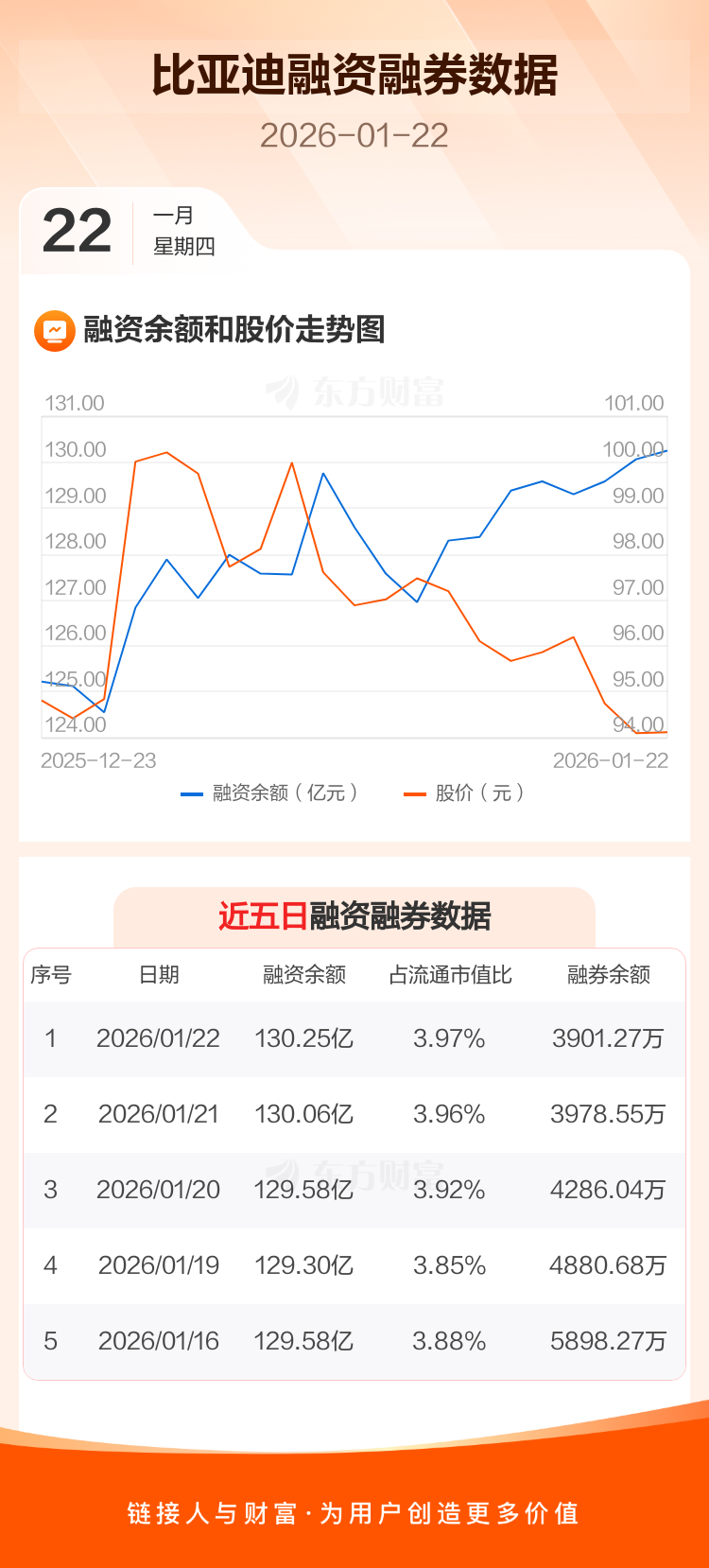 交易所最新数据显示,比亚迪于2026年1月22日获融资买入2.31亿元,融资偿还2.11亿元,当日融资净买入1928.1万元。目前,该股融资余额130.25亿,占流通市值比例为3.97%。