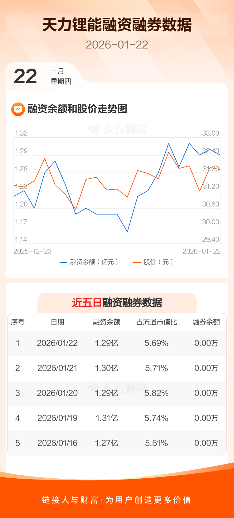 交易所最新数据显示,天力锂能于2026年1月22日获融资买入1087.31万元,融资偿还1159.03万元,当日融资净偿还71.72万元。目前,该股融资余额1.29亿,占流通市值比例为5.69%。
