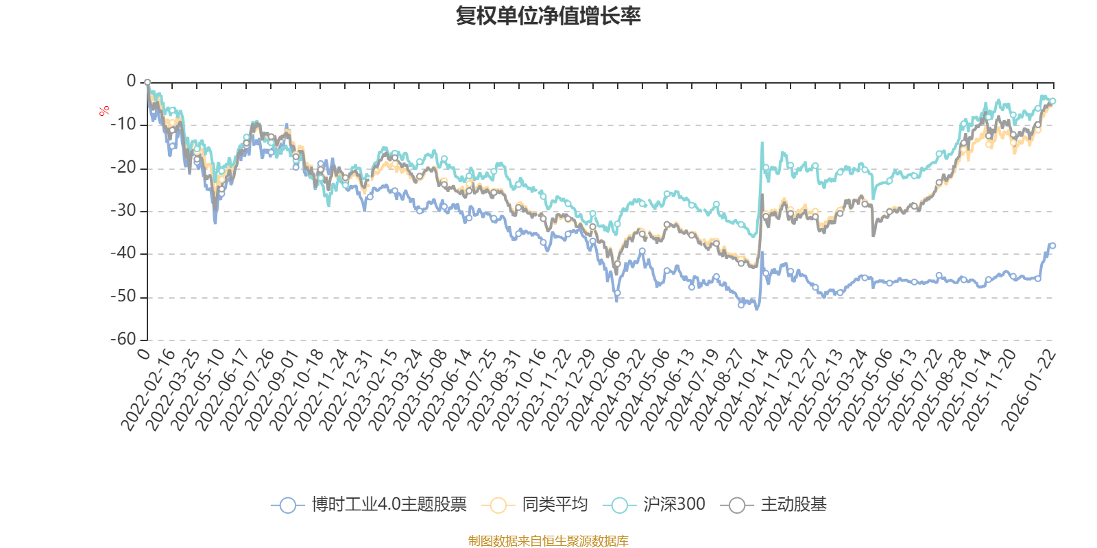 截至1月22日,博时工业4.0主题股票近三个月复权单位净值增长率为14.03%,位于同类可比基金38/121;近半年复权单位净值增长率为12.50%,位于同类可比基金88/121;近一年复权单位净值增长率为19.95%,位于同类可比基金99/119;近三年复权单位净值增长率为-18.35%,位于同类可比基金86/89。