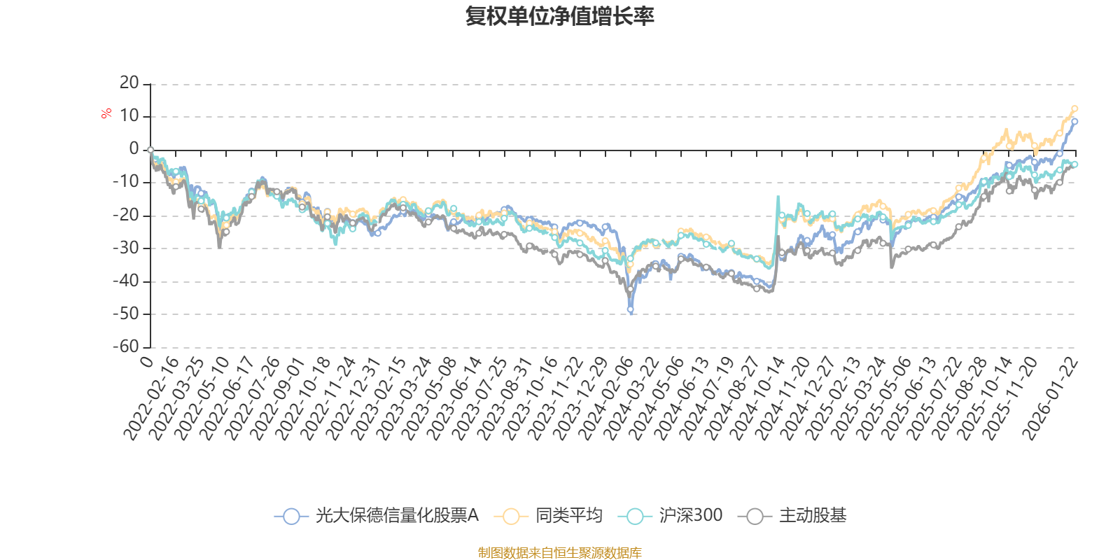 截至1月22日,光大保德信量化股票A近三个月复权单位净值增长率为13.82%,位于同类可比基金14/58;近半年复权单位净值增长率为26.69%,位于同类可比基金28/58;近一年复权单位净值增长率为51.55%,位于同类可比基金22/57;近三年复权单位净值增长率为38.51%,位于同类可比基金24/57。
