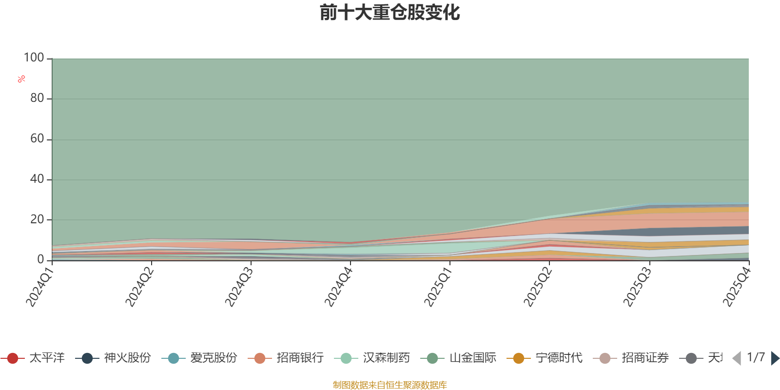 截至2025年四季度末,基金十大重仓股分别是长江电力、工商银行、山东黄金、农业银行、中金黄金、山金国际、中国银行、川投能源、睿创微纳、神火股份。