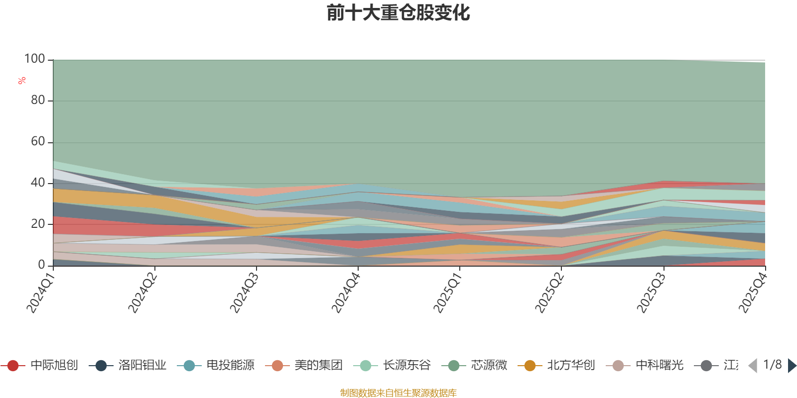 截至2025年四季度末,基金十大重仓股分别是云铝股份、天山铝业、银轮股份、中芯国际、北方华创、电投能源、万华化学、中微公司、中际旭创、国泰海通。