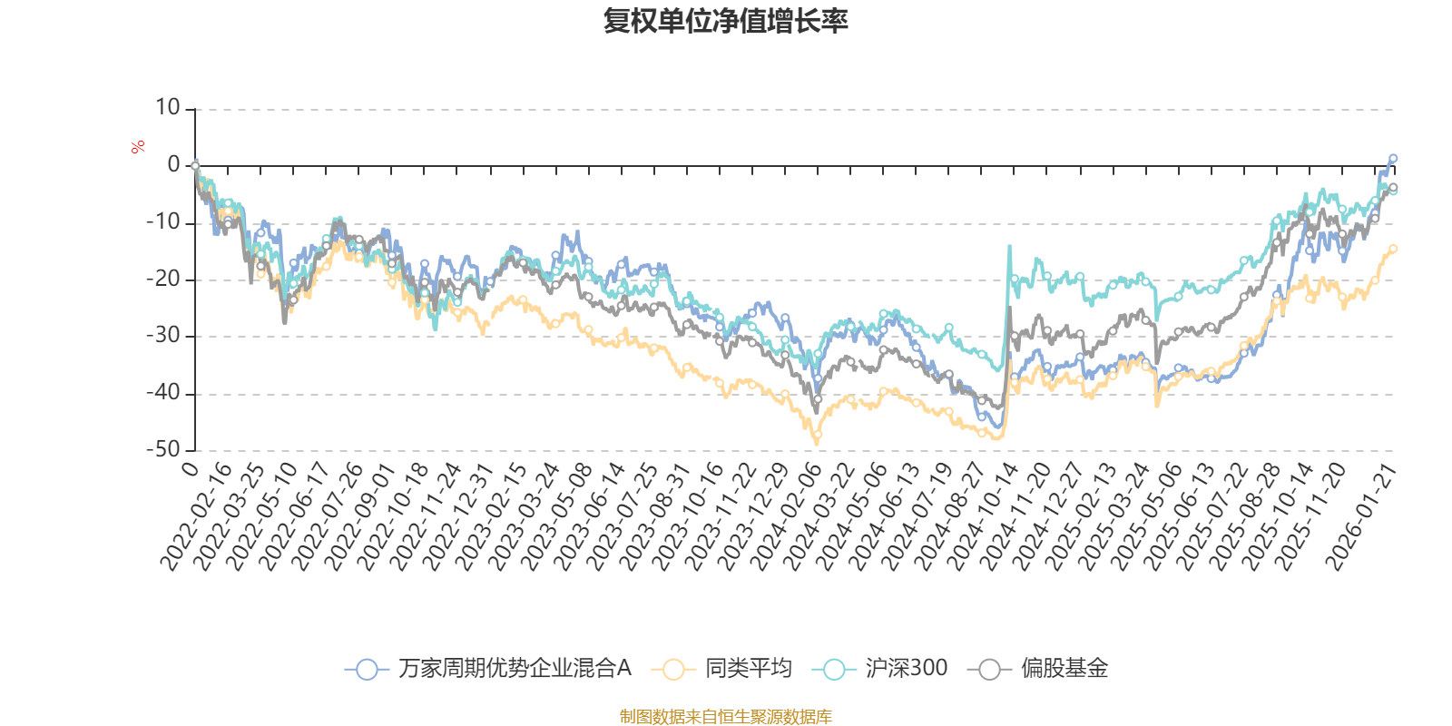 截至1月21日,万家周期优势企业混合A近三个月复权单位净值增长率为19.77%,位于同类可比基金63/689;近半年复权单位净值增长率为51.20%,位于同类可比基金60/689;近一年复权单位净值增长率为56.63%,位于同类可比基金119/673;近三年复权单位净值增长率为21.63%,位于同类可比基金156/396。