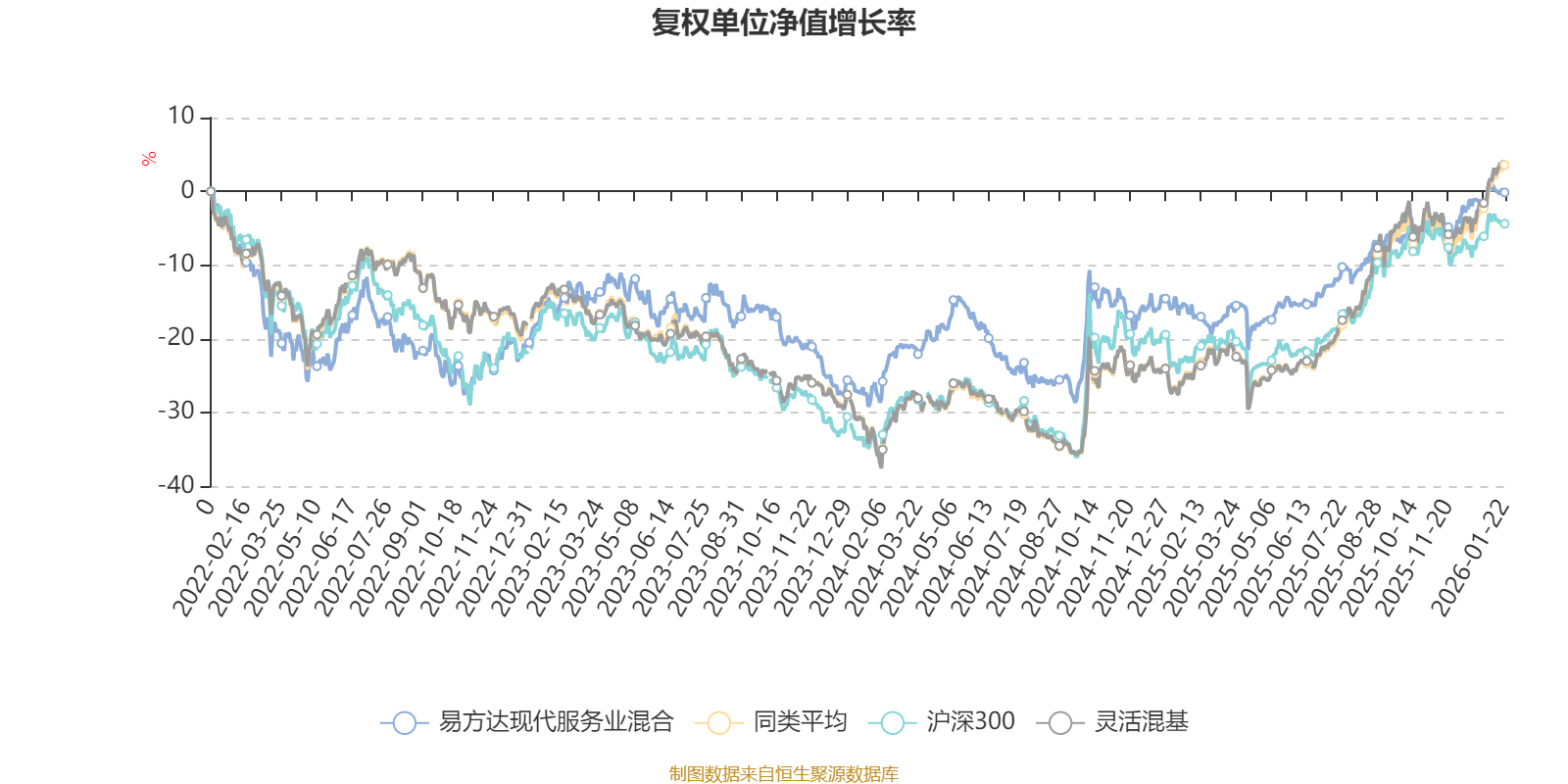 截至1月22日,易方达现代服务业混合近三个月复权单位净值增长率为6.36%,位于同类可比基金775/1286;近半年复权单位净值增长率为11.26%,位于同类可比基金905/1286;近一年复权单位净值增长率为19.33%,位于同类可比基金939/1286;近三年复权单位净值增长率为16.64%,位于同类可比基金625/1286。