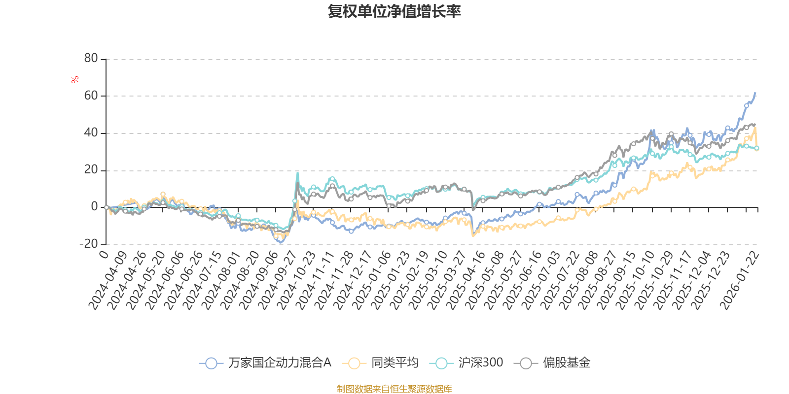 截至1月21日,万家国企动力混合A近三个月复权单位净值增长率为21.51%,位于同类可比基金25/49;近半年复权单位净值增长率为54.53%,位于同类可比基金21/49;近一年复权单位净值增长率为77.00%,位于同类可比基金20/46。