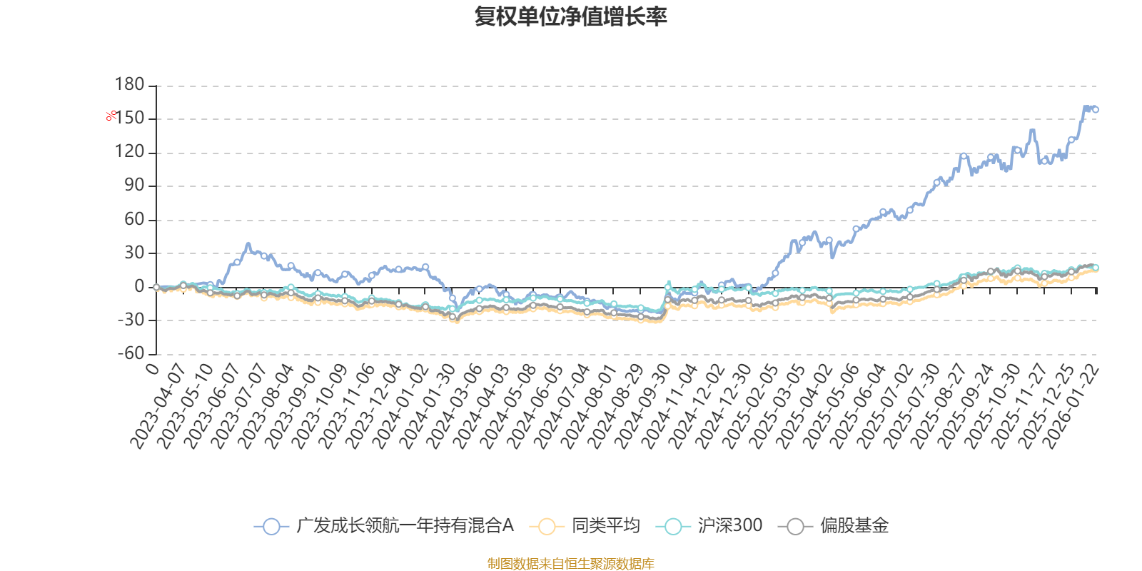 截至1月22日,广发成长领航一年持有混合A近三个月复权单位净值增长率为24.86%,位于同类可比基金16/621;近半年复权单位净值增长率为40.01%,位于同类可比基金115/621;近一年复权单位净值增长率为139.63%,位于同类可比基金1/613。