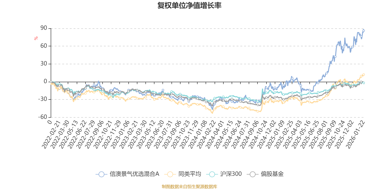 截至1月22日,信澳景气优选混合A近三个月复权单位净值增长率为20.72%,位于同类可比基金42/229;近半年复权单位净值增长率为71.94%,位于同类可比基金38/229;近一年复权单位净值增长率为82.63%,位于同类可比基金47/222;近三年复权单位净值增长率为117.21%,位于同类可比基金12/165。