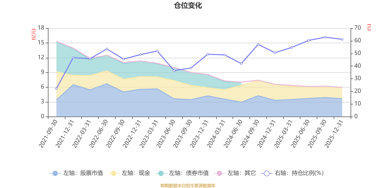 据定期报告数据统计,近三年平均股票仓位为51.18%,同类平均为67.52%。2025年三季度末基金达到62.89%的最高仓位,2021年三季度末最低,为22.19%。