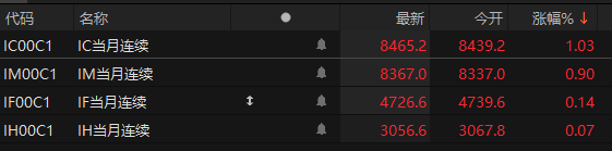 上证报中国证券网讯 1月23日早盘,股指期货普涨。9时42分,中证500股指期货(IC)主力合约上涨超过1%,中证1000股指期货(IM)主力合约上涨0.9%,沪深300股指期货(IF)主力合约上涨0.14%,上证50股指期货(IH)主力合约上涨0.07%。