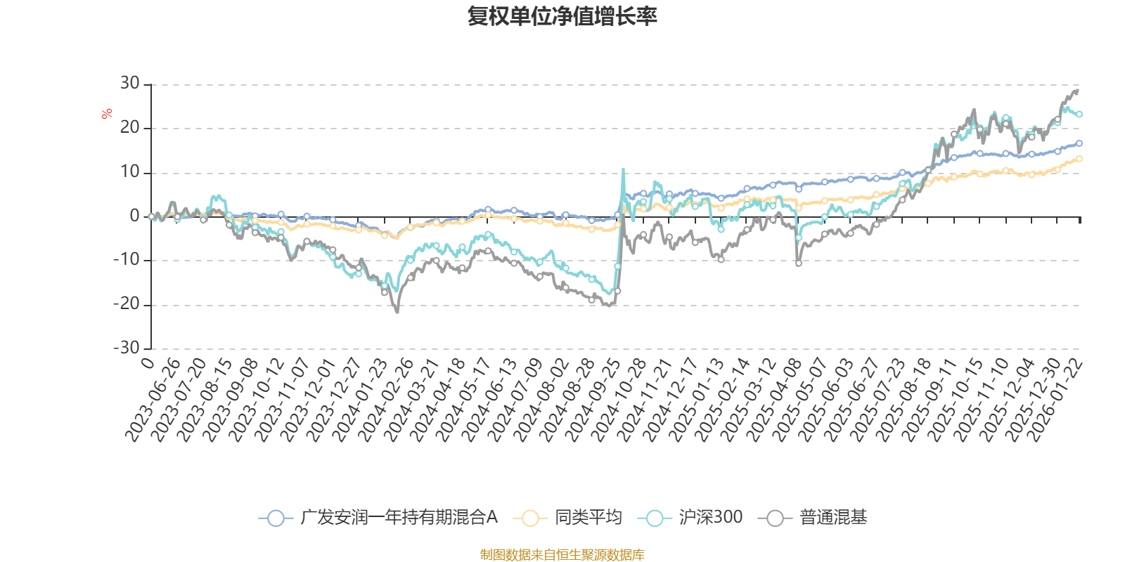 截至1月22日,广发安润一年持有期混合A近三个月复权单位净值增长率为2.24%,位于同类可比基金303/629;近半年复权单位净值增长率为6.13%,位于同类可比基金191/629;近一年复权单位净值增长率为11.34%,位于同类可比基金165/626。
