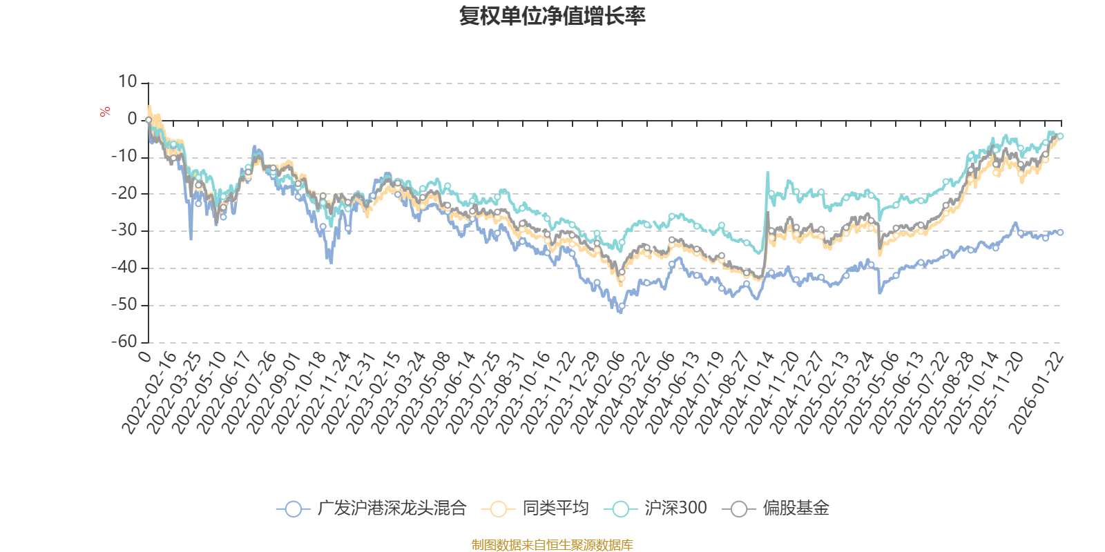 截至1月22日,广发沪港深龙头混合近三个月复权单位净值增长率为3.89%,位于同类可比基金212/265;近半年复权单位净值增长率为8.59%,位于同类可比基金236/265;近一年复权单位净值增长率为25.08%,位于同类可比基金218/265;近三年复权单位净值增长率为-18.80%,位于同类可比基金247/256。
