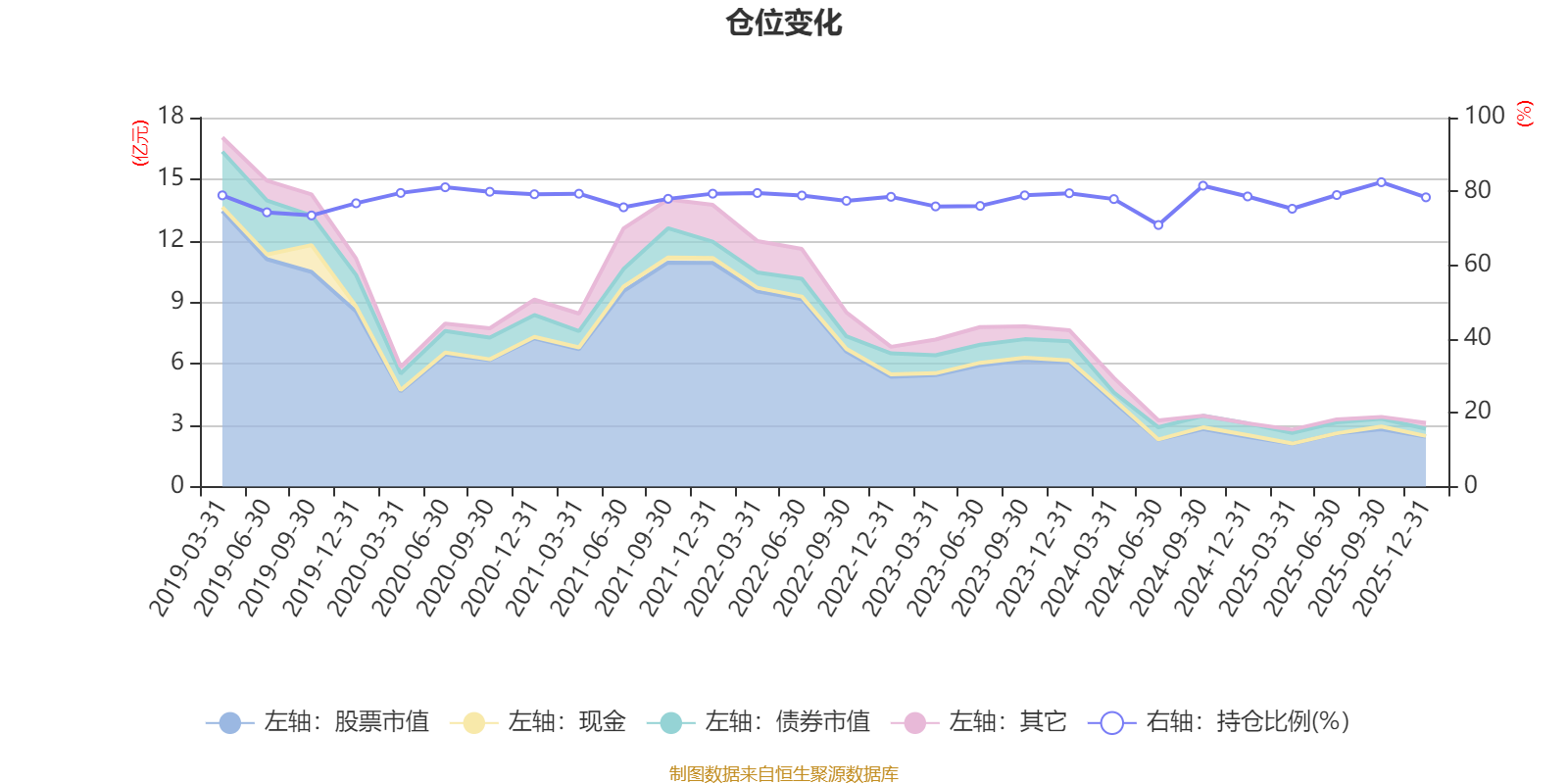 据定期报告数据统计,近三年平均股票仓位为77.88%,同类平均为72.57%。2025年三季度末基金达到82.49%的最高仓位,2024年上半年末最低,为70.89%。