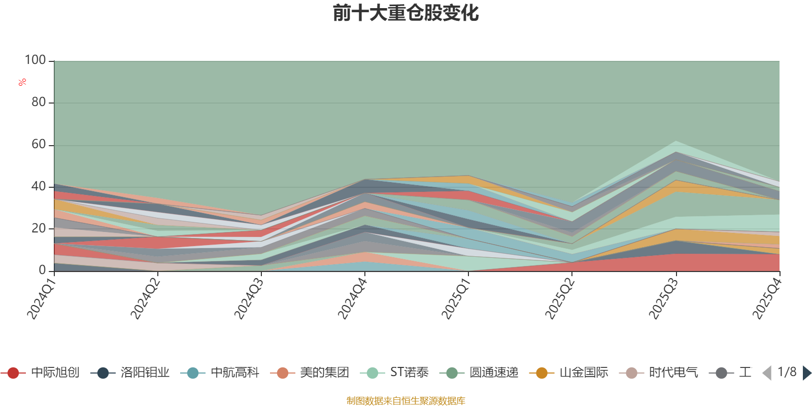 截至2025年四季度末,基金十大重仓股分别是沪电股份、中际旭创、新易盛、世纪华通、中材科技、山金国际、华友钴业、中伟新材、春秋航空、生益科技。