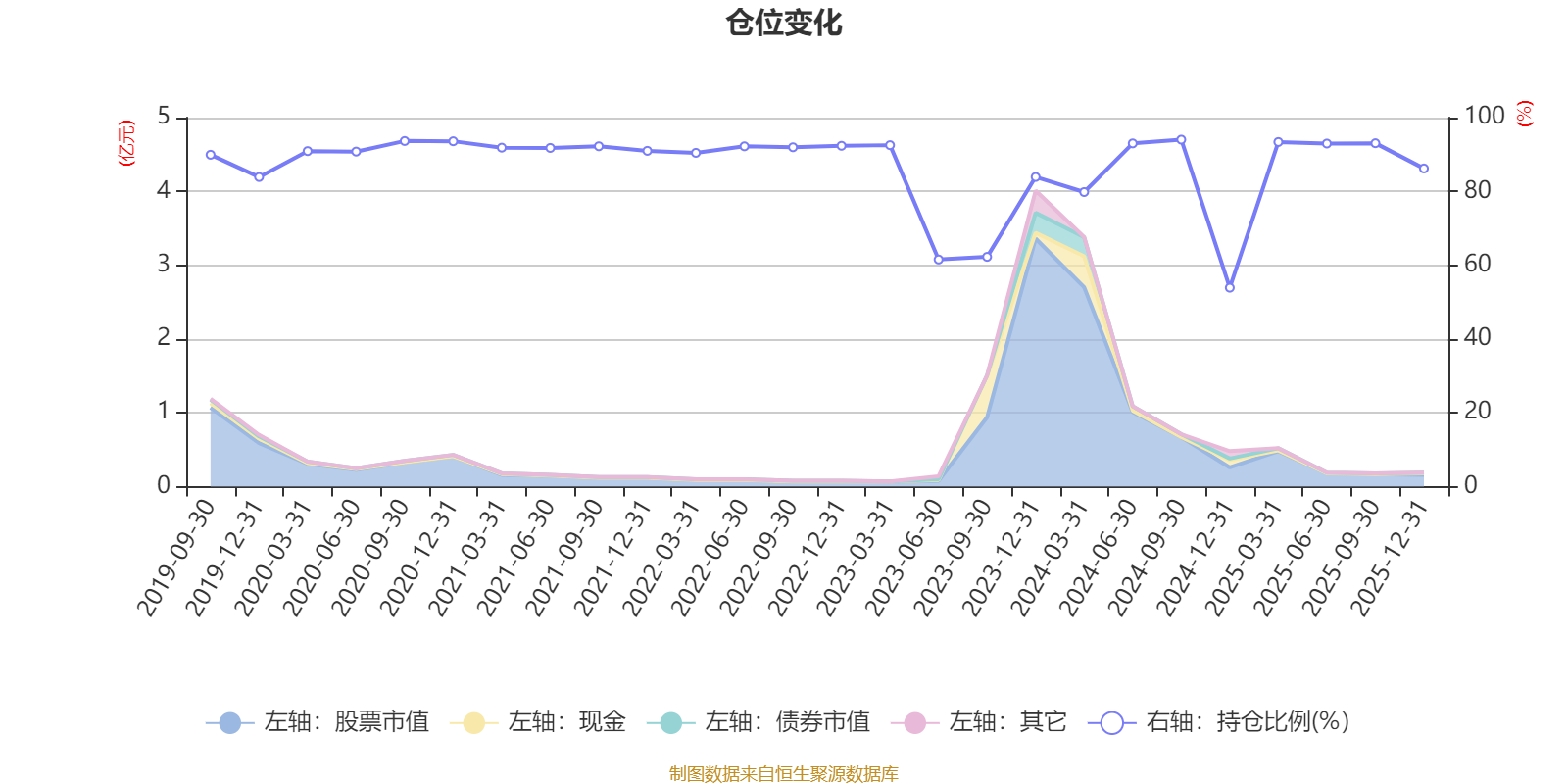据定期报告数据统计,近三年平均股票仓位为82.22%,同类平均为84.04%。2024年三季度末基金达到94.03%的最高仓位,2024年末最低,为53.9%。