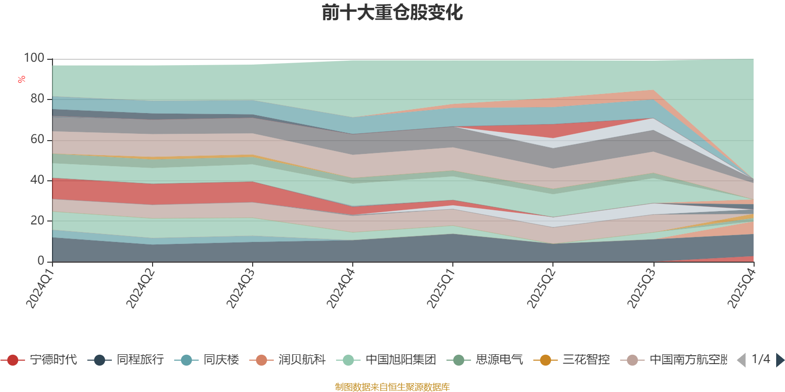 且持股标的较为稳定。截至2025年四季度末,基金十大重仓股分别是同程旅行、春秋航空、润贝航科、宁德时代、阳光电源、国泰海通、紫金矿业、三花智控、中国国航、思源电气。