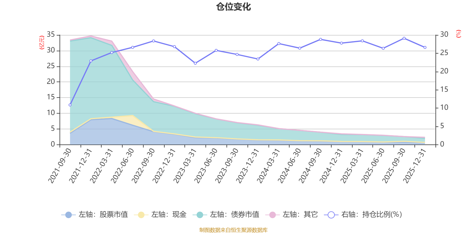 据定期报告数据统计,近三年平均股票仓位为26.43%,同类平均为19.2%。2025年三季度末基金达到29.1%的最高仓位,2021年三季度末最低,为10.85%。