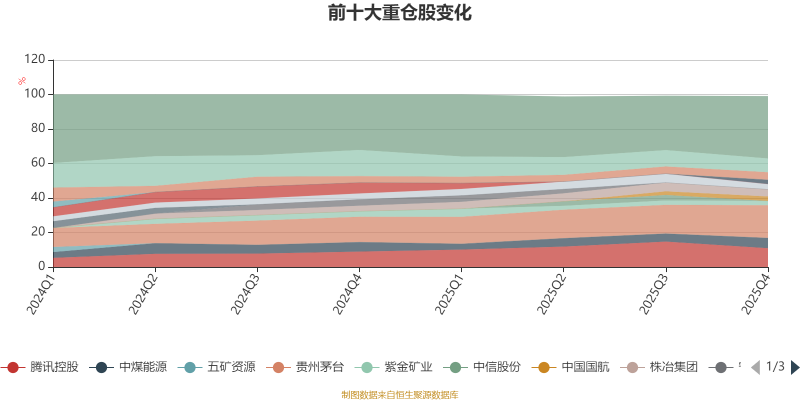 该基金持股集中度较高,近2年前十大重仓股集中度长期超过60%。截至2025年四季度末,基金十大重仓股分别是贵州茅台、腾讯控股、中国海洋石油、中煤能源、五粮液、株冶集团、铜陵有色、中国国航、紫金矿业、中国南方航空股份。