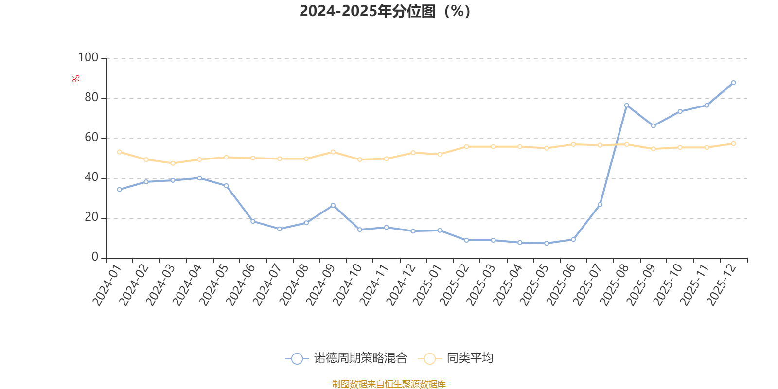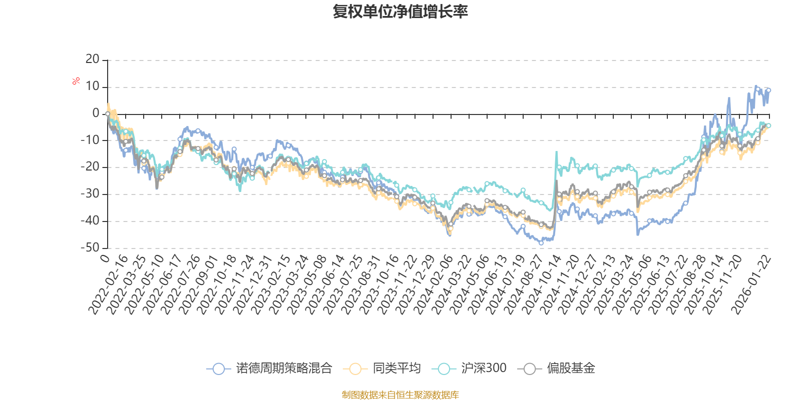截至1月22日,诺德周期策略混合近三个月复权单位净值增长率为15.24%,位于同类可比基金47/265;近半年复权单位净值增长率为62.84%,位于同类可比基金10/265;近一年复权单位净值增长率为74.97%,位于同类可比基金17/265;近三年复权单位净值增长率为21.28%,位于同类可比基金113/256。