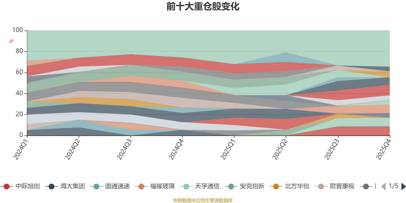 该基金持股集中度较高,近2年前十大重仓股集中度长期超过60%。截至2025年四季度末,基金十大重仓股分别是新易盛、中际旭创、生益科技、天孚通信、工业富联、剑桥科技、沪电股份、长芯博创、鼎通科技、中微公司。