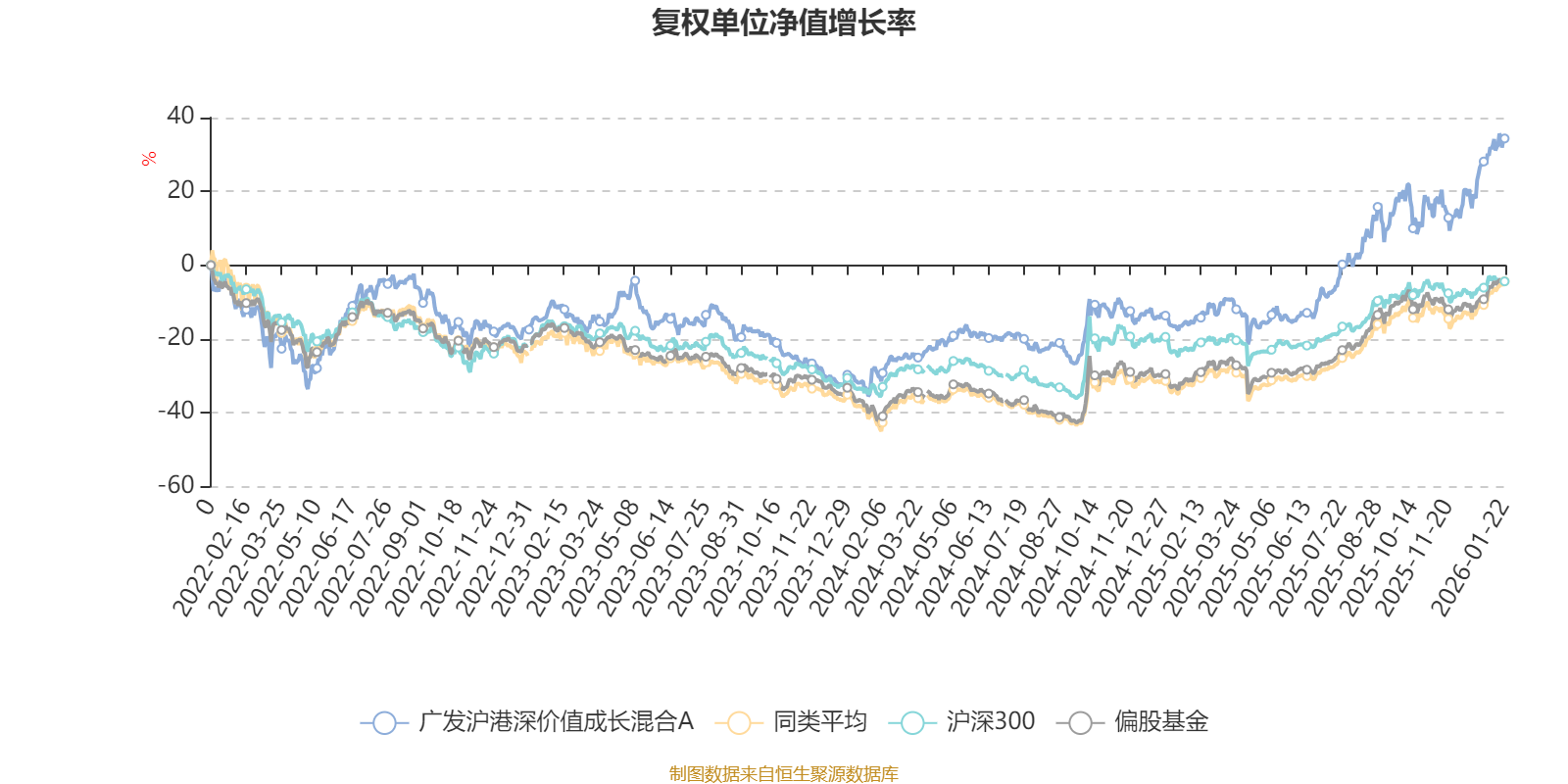 截至1月22日,广发沪港深价值成长混合A近三个月复权单位净值增长率为21.18%,位于同类可比基金12/265;近半年复权单位净值增长率为34.06%,位于同类可比基金63/265;近一年复权单位净值增长率为59.87%,位于同类可比基金43/265;近三年复权单位净值增长率为54.34%,位于同类可比基金19/256。