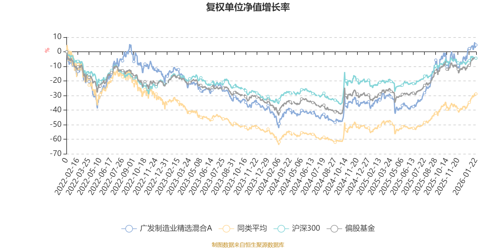 截至1月22日,广发制造业精选混合A近三个月复权单位净值增长率为12.89%,位于同类可比基金46/100;近半年复权单位净值增长率为45.59%,位于同类可比基金23/100;近一年复权单位净值增长率为56.50%,位于同类可比基金28/92;近三年复权单位净值增长率为20.94%,位于同类可比基金24/68。