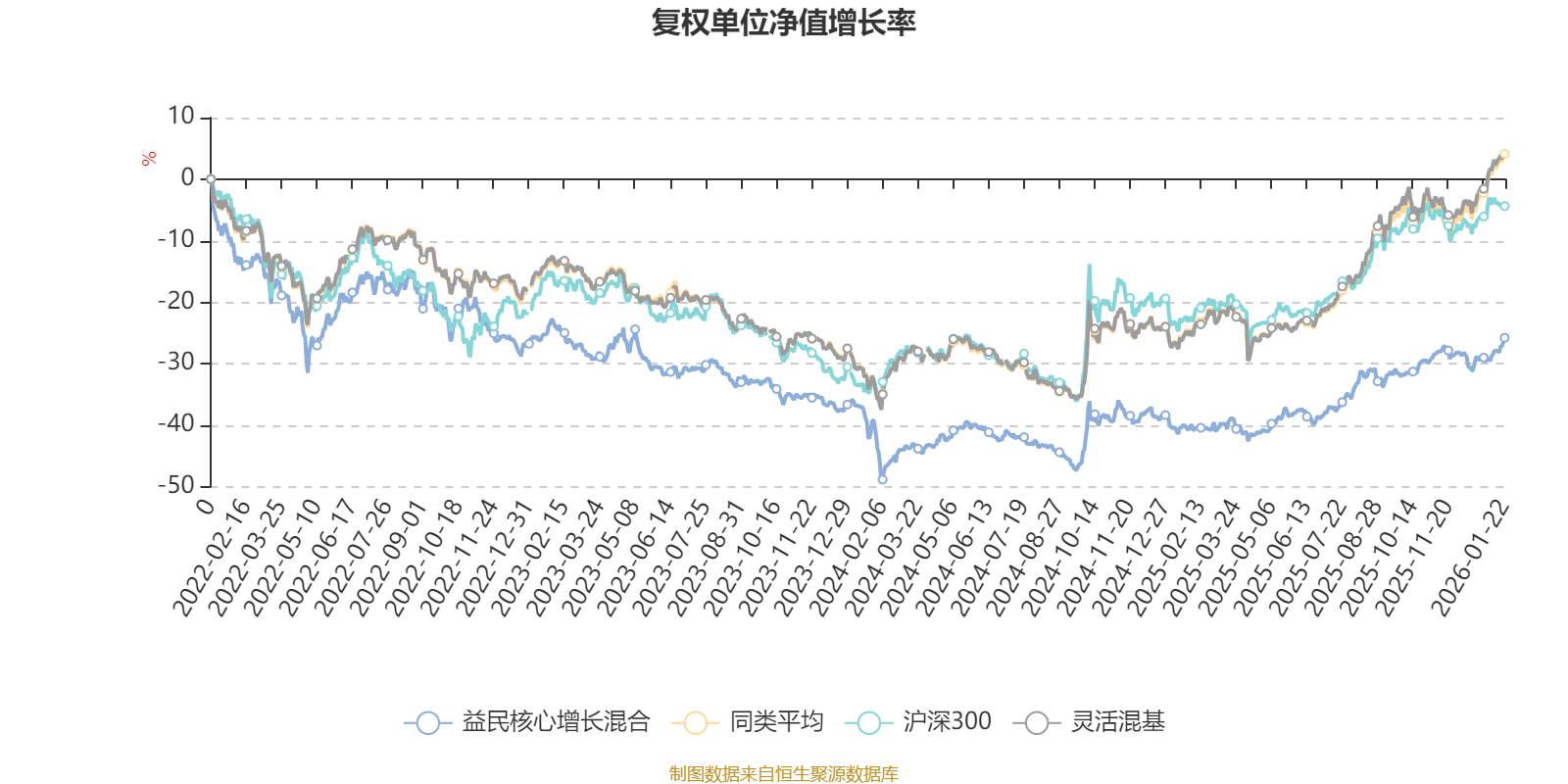 截至1月22日,益民核心增长混合近三个月复权单位净值增长率为5.58%,位于同类可比基金825/1286;近半年复权单位净值增长率为16.43%,位于同类可比基金781/1286;近一年复权单位净值增长率为25.36%,位于同类可比基金814/1286;近三年复权单位净值增长率为-1.15%,位于同类可比基金1032/1286。