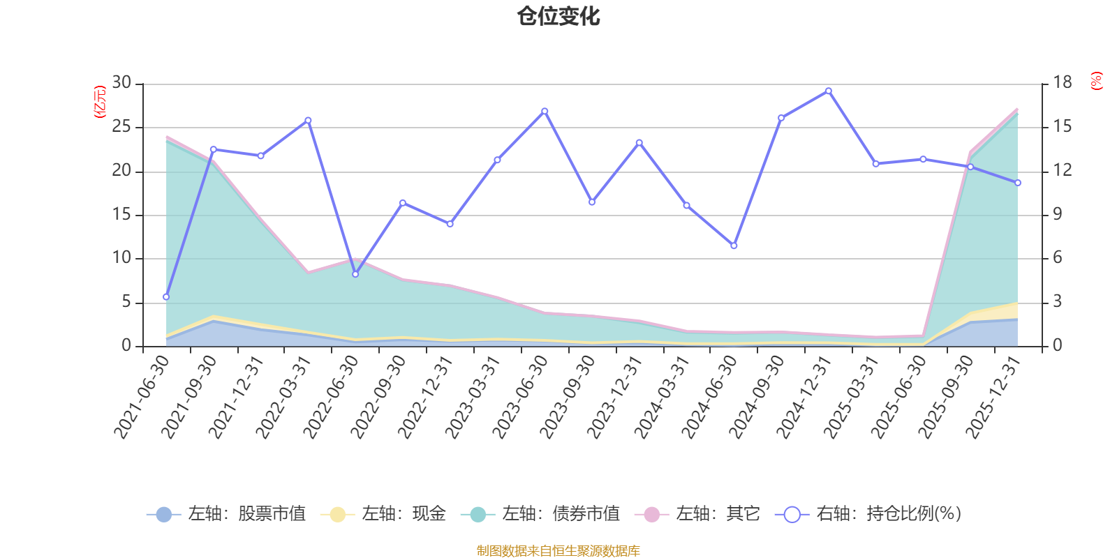 据定期报告数据统计,近三年平均股票仓位为12.61%,同类平均为19.2%。2024年末基金达到17.51%的最高仓位,2021年上半年末最低,为3.39%。