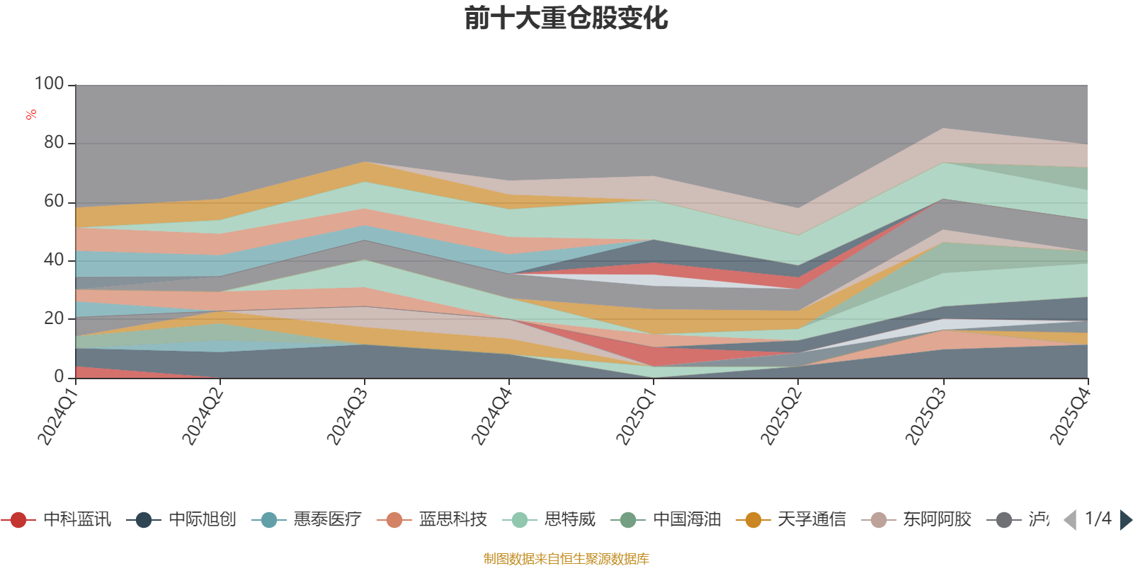 该基金持股集中度较高。截至2025年四季度末,基金十大重仓股分别是新易盛、中际旭创、水晶光电、九号公司、沪电股份、渝农商行、中国平安、工业富联、天孚通信、生益科技。