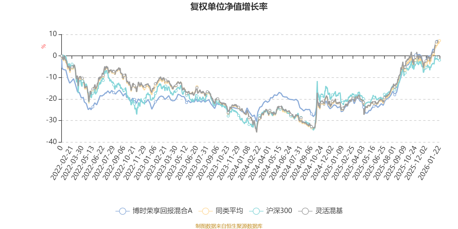 截至1月16日,博时荣享回报混合A近三个月复权单位净值增长率为6.91%,位于同类可比基金752/1286;近半年复权单位净值增长率为33.05%,位于同类可比基金379/1286;近一年复权单位净值增长率为44.09%,位于同类可比基金421/1286;近三年复权单位净值增长率为34.96%,位于同类可比基金324/1286。