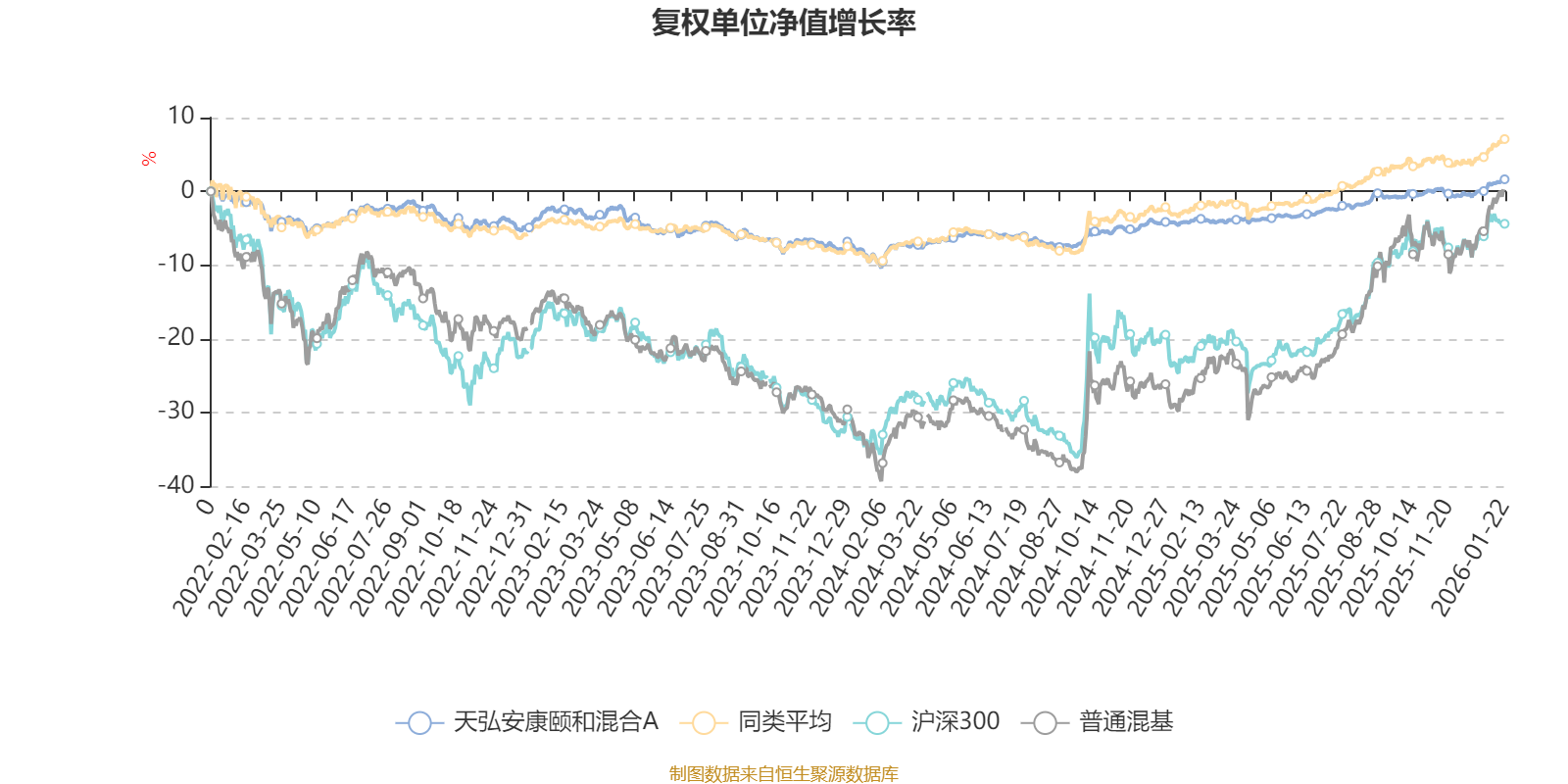 截至1月22日,天弘安康颐和混合A近三个月复权单位净值增长率为2.10%,位于同类可比基金319/629;近半年复权单位净值增长率为3.65%,位于同类可比基金369/629;近一年复权单位净值增长率为6.09%,位于同类可比基金409/626;近三年复权单位净值增长率为4.06%,位于同类可比基金485/564。