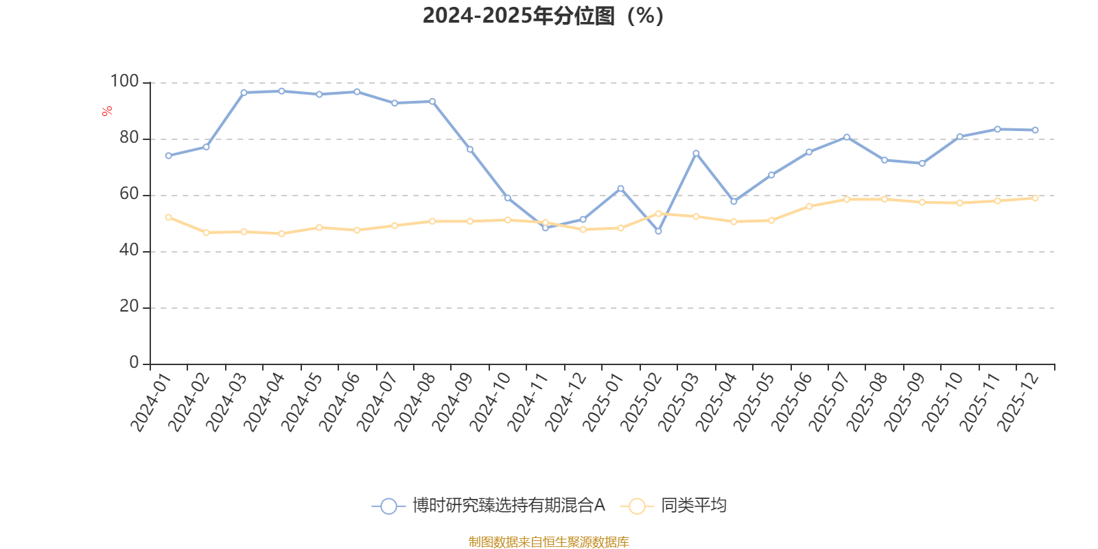 通过所选区间该基金净值增长率分位图,可以观察该基金与同类基金业绩比较情况。图为坐标原点到区间内某时点的净值增长率在同类基金中的分位数。