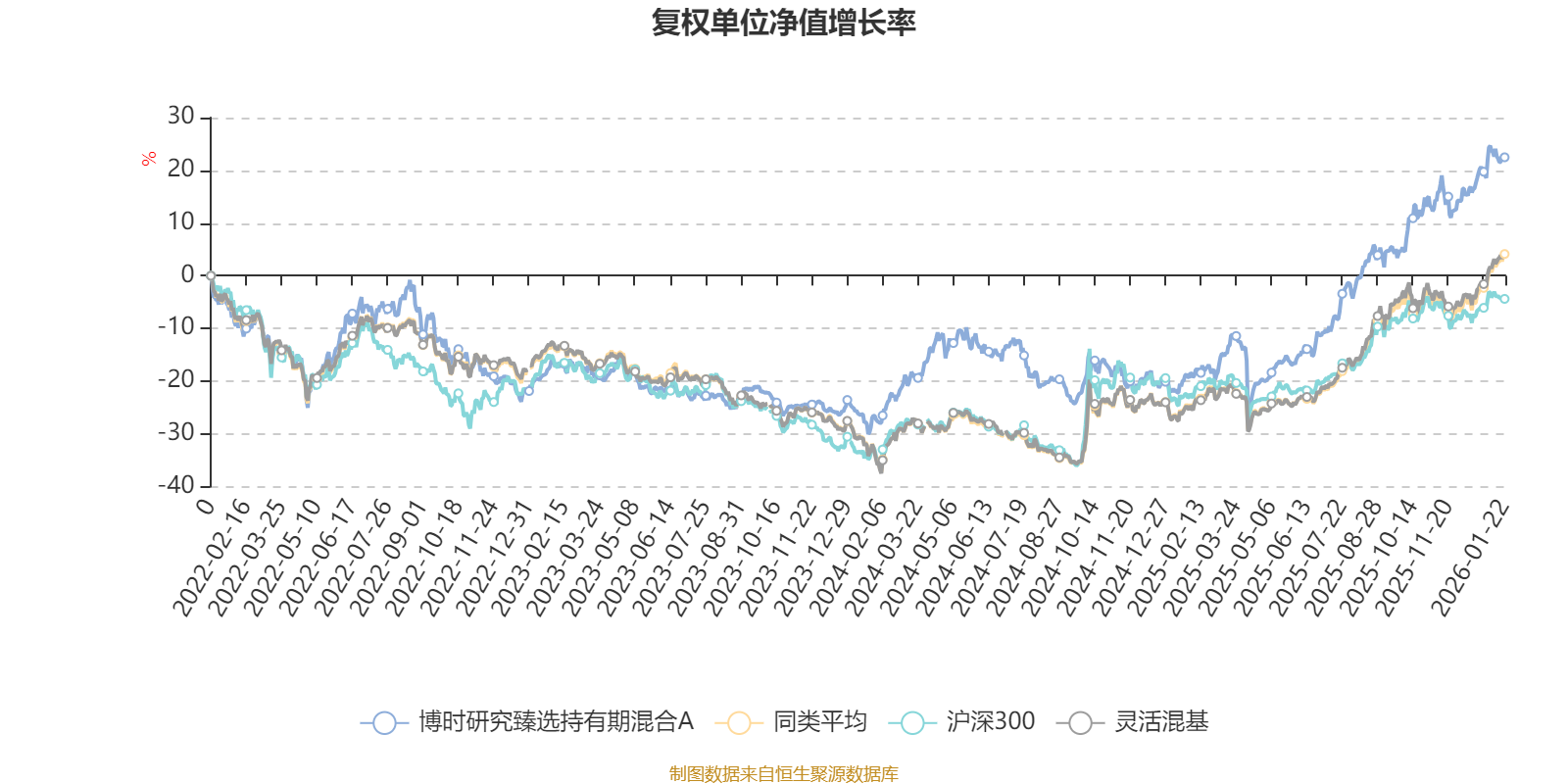 截至1月22日,博时研究臻选持有期混合A近三个月复权单位净值增长率为9.97%,位于同类可比基金573/1286;近半年复权单位净值增长率为26.81%,位于同类可比基金503/1286;近一年复权单位净值增长率为51.40%,位于同类可比基金317/1286;近三年复权单位净值增长率为49.04%,位于同类可比基金192/1286。