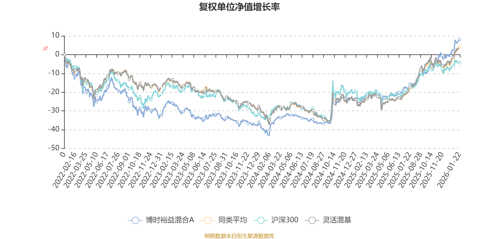 截至1月22日,博时裕益混合A近三个月复权单位净值增长率为16.02%,位于同类可比基金250/1286;近半年复权单位净值增长率为27.99%,位于同类可比基金478/1286;近一年复权单位净值增长率为41.66%,位于同类可比基金484/1286;近三年复权单位净值增长率为44.91%,位于同类可比基金220/1286。